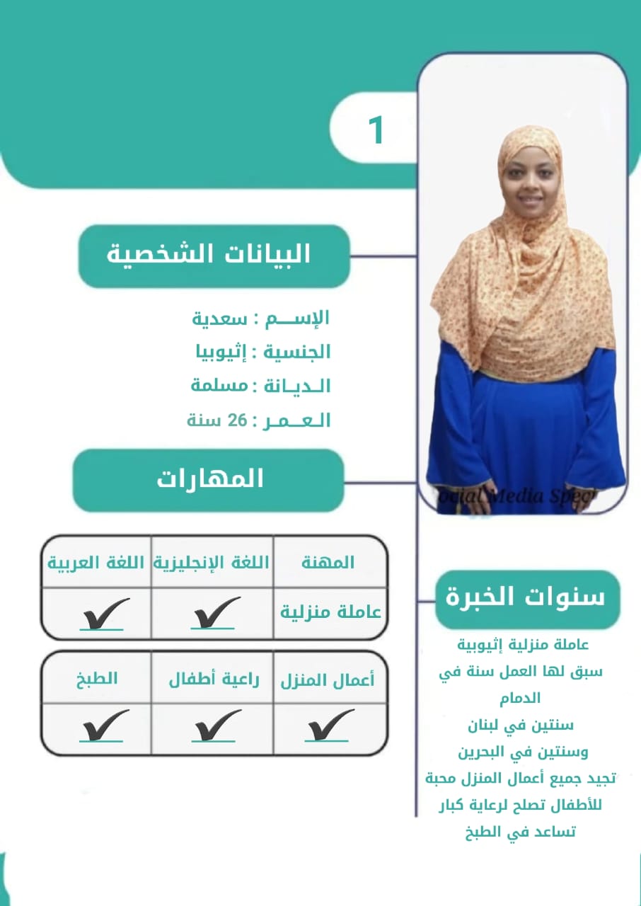 نعم، الخادمة سعدية لديها خبرة في رعاية الأطفال ومساعدة كبار السن، مع التزام عالٍ بالنظافة والترتيب داخل المنزل.